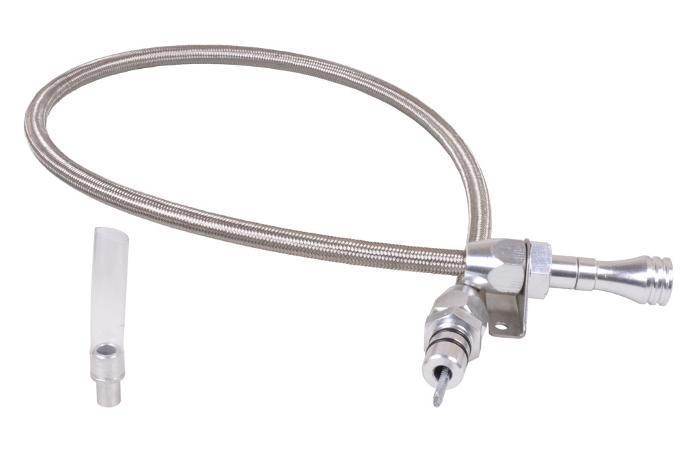 Designed for transmissions that require a push-in dipstick, JEGS Flexible Braided Stainless Steel Transmission Dipsticks have a polished or black billet aluminum handle, double O-ring tube seal, and fluid level markings. Designed for bellhousing or firewall mounting each dipstick comes complete with a funnel adapter for easy filling.