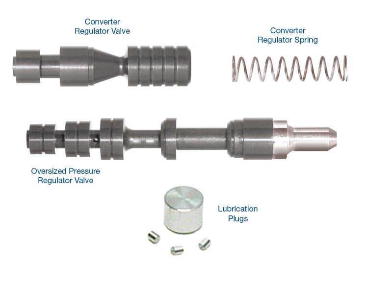 The Sonnax oversized pressure regulator and converter regulator valve kit featires a converter regulator valve and PR valve which work together to limit converter pressure, yet ensure flow continues during a failsafe condition.