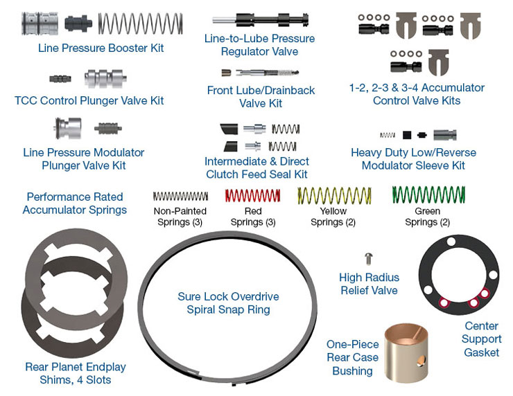 This Sonnax Performance Pack offers innovative, heavy-duty calibration for firmer shifts under load without sacrificing low-speed drivability. Precision components upgrade the 4R100 for maximum performance and durability by recalibrating pressures and shift accumulation. Durable, improved parts target commonly worn areas in the transmission to repair damage and prevent future wear and tear.