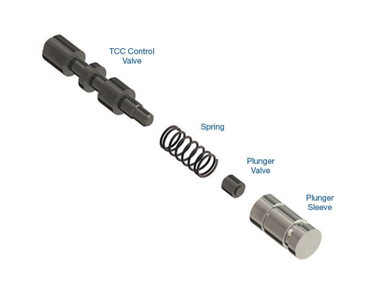 The OE design of the TCC control valve in VW/Audi 09A and Jatco JF506E allows for smooth apply and control of exhaust release oil. However, if there is any converter or cooler restriction, converter feed is reduced. This allows the valve to stroke prior to lockup command, resulting in premature TCC apply. This can be aggravated by wear at the plunger valve sleeve due to continuous oscillation, allowing the oil pressure needed to hold the control valve in the release position to exhaust instead. The Sonnax TCC control valve kit includes a redesigned plunger valve assembly and control valve to prevent premature TCC apply. The Sonnax TCC control valve has eliminated the controlled release exhaust reaction spool, which often has a worn bore that causes lockup complaints. The plunger valve sleeve has been extended to aid in sealing this circuit. An orifice plug is included to block the controlled release circuit. These changes prevent the control valve from stroking prior to lockup command due to any converter or cooler restrictions, and are designed to result in a short and firmer TCC apply than OE.